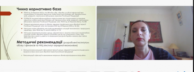 «Оцінка збитків завданих сільськогосподарським підприємствам війною» (директор ТОВ «Всеукраїнський інститут права і оцінки», д.е.н, старшому науковому співробітнику Юлія Бездушна);
