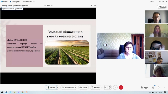 «Земельні відносини в умовах воєнного стану» (завідувач кафедри обліку та оподаткування, д.е.н., професор Любов Гуцаленко);