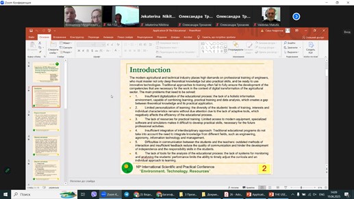 19–20-го червня поточного року в латвійському місті Резекне, в університеті: «Rezekne Academy of Technologies» (який є центром Ризького Технічного Університету), відбулася XVI Міжнародна науково-практична конференція «Environment. Technology. Resources» (Довкілля. Технології. Ресурси), значна частина якої була присвячена науково-педагогічним дослідженням в галузі сільськогосподарського навчання, зокрема сучасних методик, які наразі застосовуються для підготовки фахівців для сучасної аграрної галузі. Конференція проводилася у змішаному форматі. Участь співробітників НУБіП України відбувалась в дистанційному форматі. В роботі цієї Міжнародної конференції взяли участь більш ніж 100 доповідачів з України, Німеччини, Латвії, Литви, Естонії, Болгарії, Індії та інших країн Європи та світу.