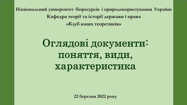22 березня 2022 р. на черговому засіданні наукова керівниця Віра Качур провела ознайомчу лекцію «Оглядові документи: поняття, види, характеристика».