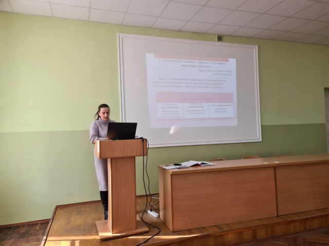 04 березня 2024 р. доцентка кафедри теорії та історії держави і права Олена Попова провела відкриту лекцію з навчальної дисципліни «Правова культура особистості» для студентів 3 курсу спеціальності "Технологія виробництва і переробки продукції тваринництва". Тема «Реалізація суб'єктивних юридичних прав та юридичних обов'язків» завжди є цікавою для студентів. І вчергове це було підтверджено.
