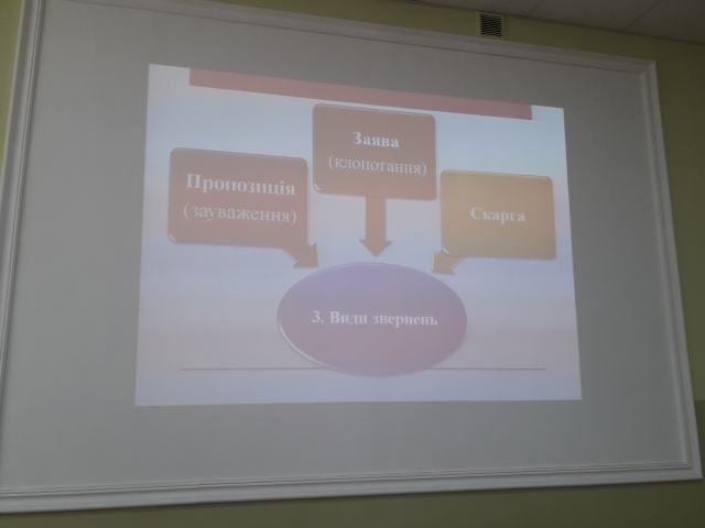 Лекція була присвячена тематиці реалізації суб'єктивних юридичних прав та юридичних обов'язків, право громадян на звернення, видам звернень, а також відповідальності за порушення законодавства про звернення громадян. При підготовці та викладенні лекційного матеріалу, викладач дотримувалась необхідних організаційних та науково-методичних вимог, під час проведення лекції був освітлений необхідний об’єм науково - методичного матеріалу з даної дисципліни згідно учбової програми, з наведенням практичних прикладів та ситуаційних випадків. Лекція проводилась в очному форматі із залученням сучасних технологічних засобів та дотриманням необхідних вимог.