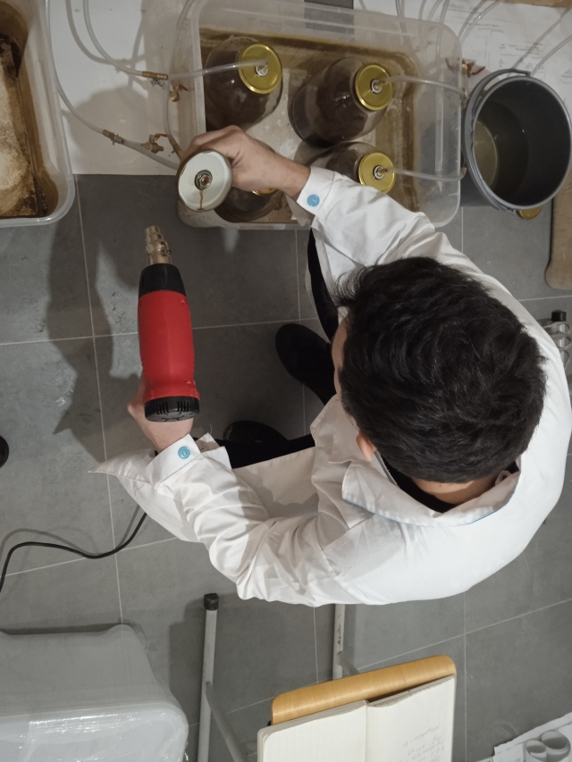 Майстер виробничого навчання кафедри технічного сервісу та інженерного менелджменту імені М. П. Момотенка Олександр ХМЕЛЬОВСЬКИЙ відпрацьовує функціонал і налаштовує газгольдер для виробництва біометану до виконання наукового проекту Horizont Ukraine.
