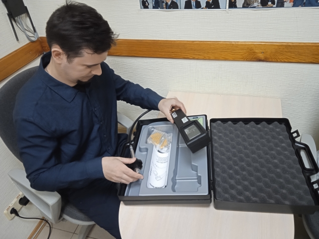 - Майстер виробничого навчання кафедри технічного сервісу та інженерного менелджменту імені М. П. Момотенка Олександр ХМЕЛЬОВСЬКИЙ відпрацьовує функціонал і налаштовує компресометр для проведення лабораторної роботи.