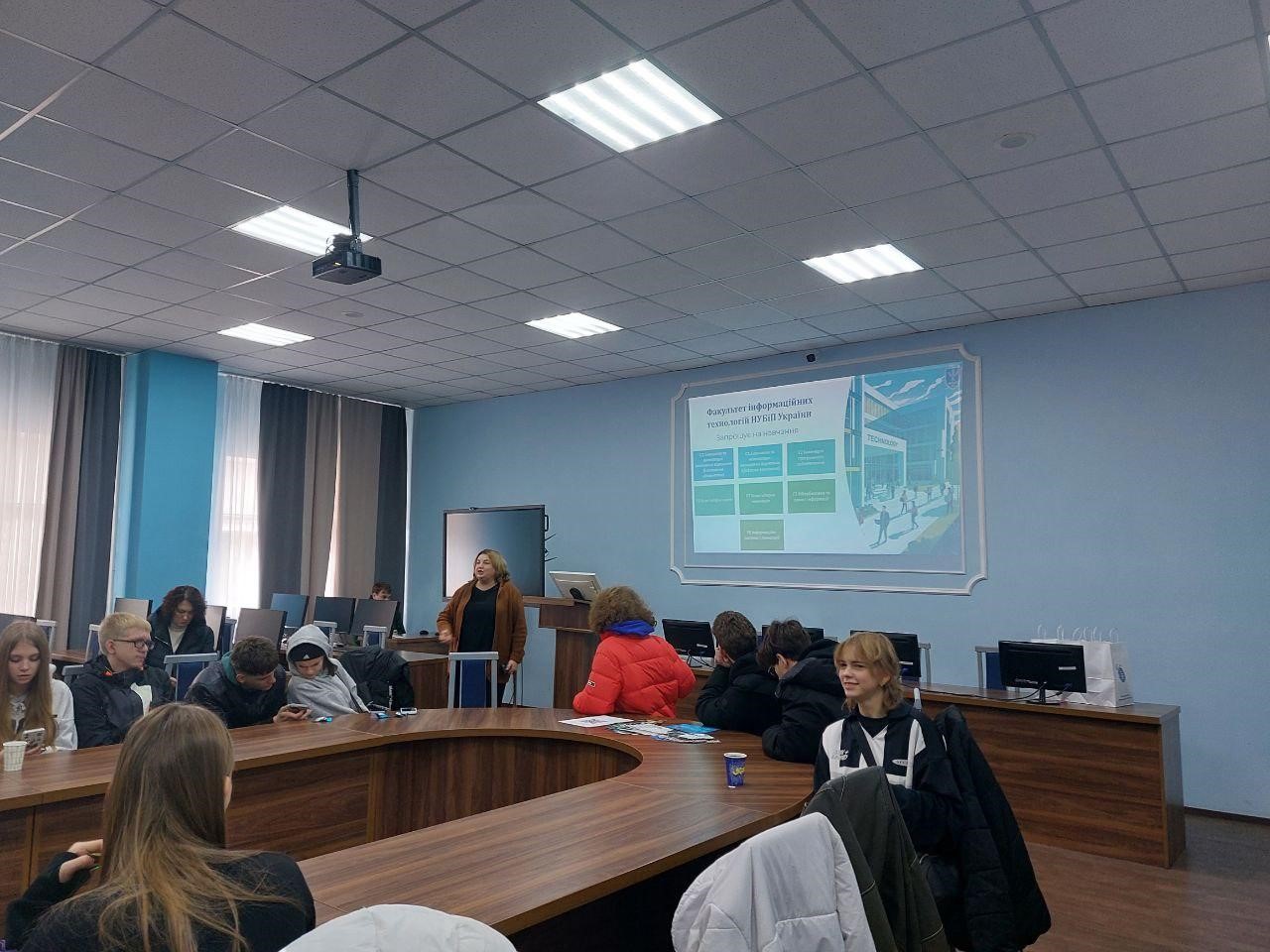 На факультеті інформаційних технологій майбутні вступники відвідали сучасні лабораторії, серед яких навчальні лабораторії Cisco Academy, Кіберполігон, а також навчальну лабораторію програмування роботів. Гостям продемонстрували приклади програмування роботів, інструменти мережевого адміністрування та рішення в галузі кібербезпеки, а також по завершенню почастували чаєм та смаколами. Розповівши про можливості навчання на факультеті.