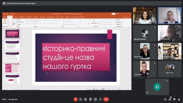 Перше засідання гуртка «Історико-правничі студії» було присвячено організаційним аспектам, на якому, секретар гуртка Анастасія Кучер, презентувала презентацію у якій було окреслено мета, завдання та план гуртка на 2021 р. та затверджено її кандидатуру як секретаря.