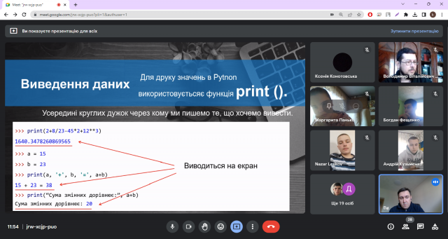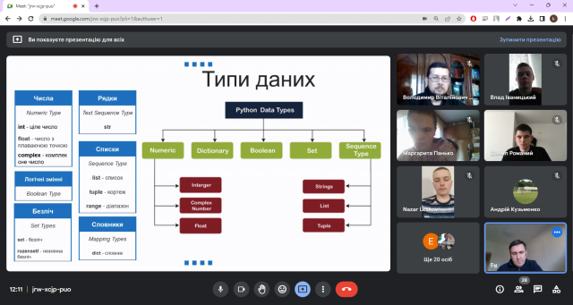 На лекції студенти ознайомились з основами організації роботи з даними в мові програмування Python, зокрема з типами даних, операціями з ними та способами введення/виведення інформації.