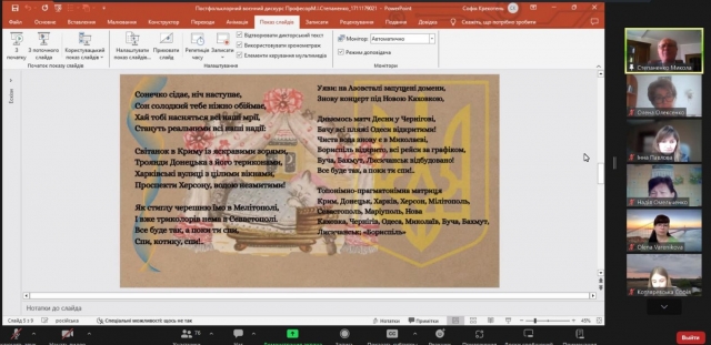 Тема лекції «Постфольклорний воєнний дискурс: лінгвокреативний вимір» стосувалася тих викликів часу, спричинених російською агресією, які не могли не відобразитися на змістовому наповненні звичних формою фольклорних жанрів замовляння, колискової, колядки, щедрівки, примовляння, анекдоту.