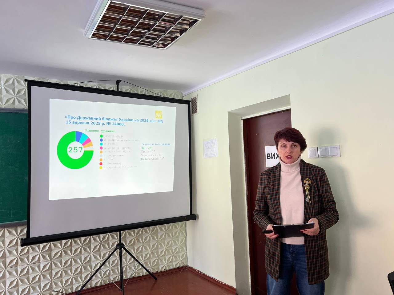 У межах першого дня з доповіддю «Державний бюджет України на 2026 рік: ключові статті видатків і доходів» виступила БОНДАРЧУК Ірина Павлівна, викладач економічних дисциплін, спеціаліст вищої категорії, викладач-методист.