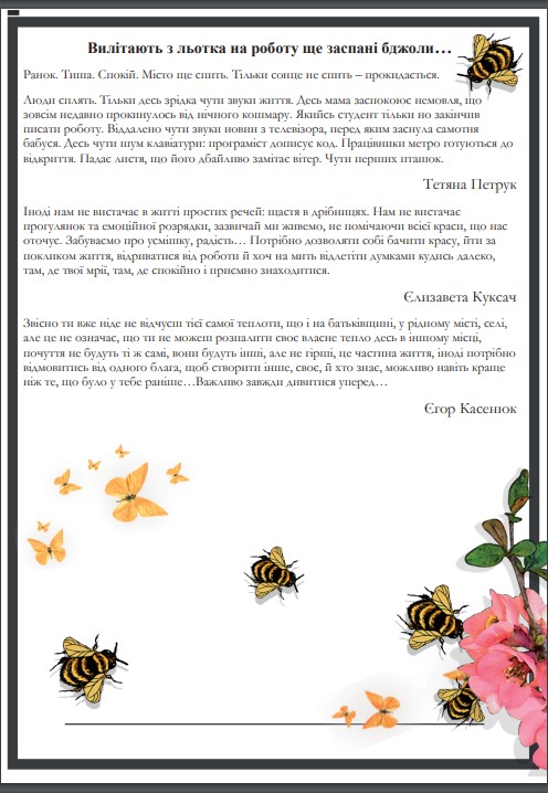 – Ми, як і першокурсники, побачили кінцевий результат своєї праці тільки зараз, – зізнається співавторка дайджесту Катерина Домбровська. Маємо якісь досягнення тому, що нам допомагав наш наставник Іван Сергійович. Тож щира йому вдячність за це.
