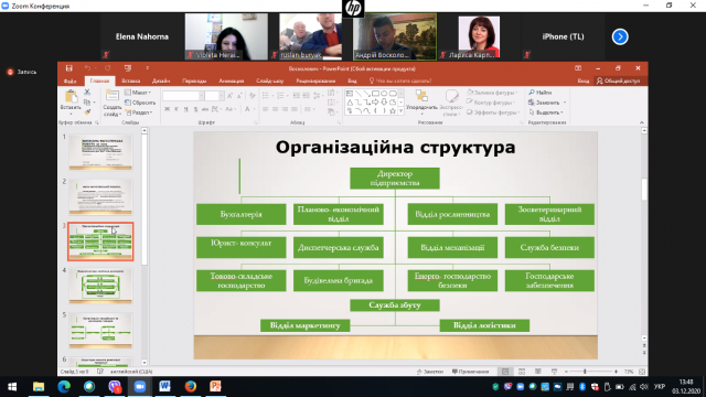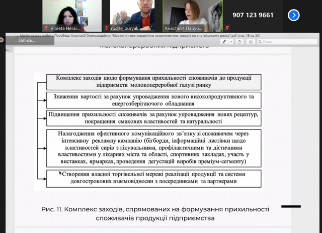 Екзаменаційна комісія розпочала свою онлайн роботу через сервіс Zoom. З вступним словом до студентів та комісії звернувся декан факультету аграрного менеджменту, доцент Остапчук Анатолій Дмитрович, оголосивши наказ ректора Станіслава Миколайовича Ніколаєнка про склад екзаменаційної комісії та побажавши студентам успішного захисту магістерських робіт. Голова комісії – Тетяна Леонідівна – також приєдналася до вітальних слів, ознайомив студентів із регламентом проведення захисту та розпочала роботу ЕК та захист магістерських робіт.