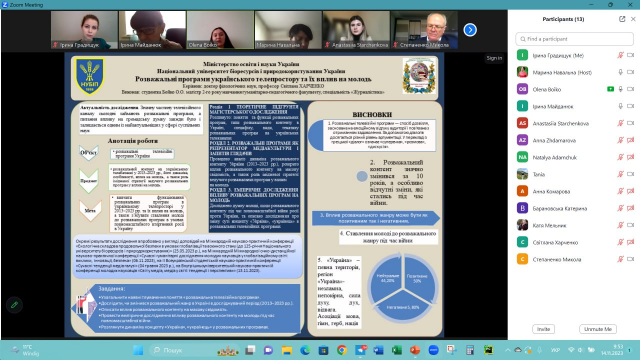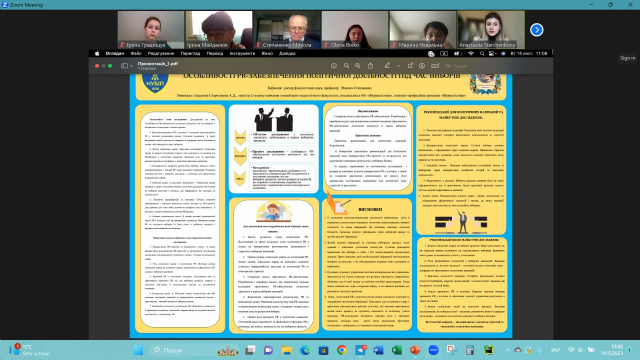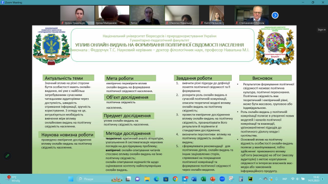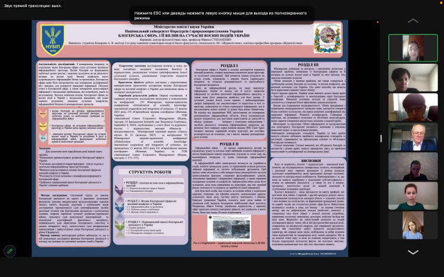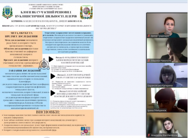 «Блогерська сфера і її вплив на сучасні воєнні події в Україні» (виконавець: Анна Комарова, науковий керівник: проф. Микола Степаненко): робота висвітлювала роль блогерів у формуванні громадської думки під час військових конфліктів, а також їх вплив на інформаційний простір.