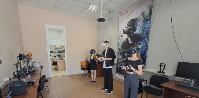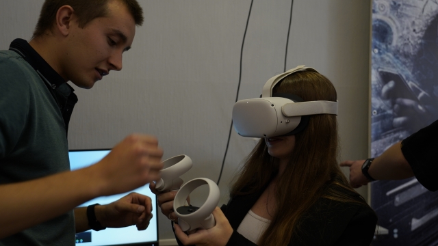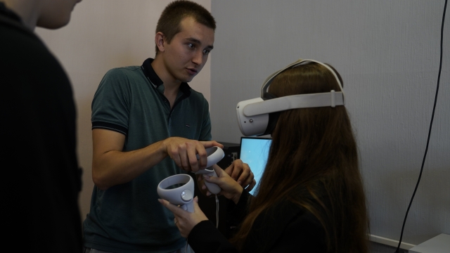 Особливо зацікавили школярів віртуальний світ в шоломній системі Samsung Oculus. Презентував роботу у 3-Д вимірі (VR) асистент кафедри Богдан Остроушко, випускник кафедри комп'ютерних систем, мереж та кібербезпеки.
