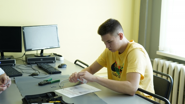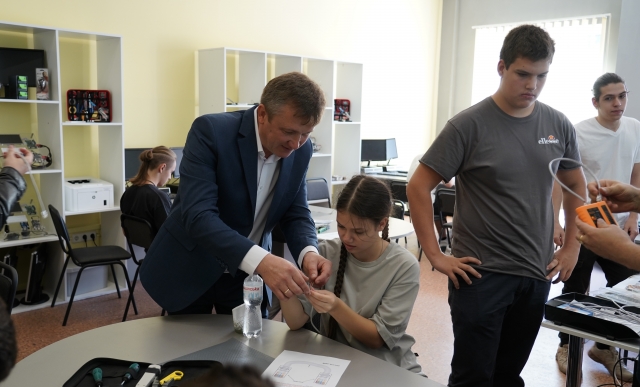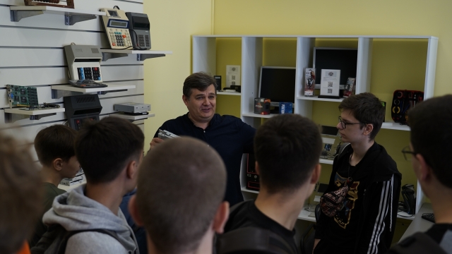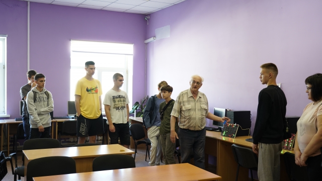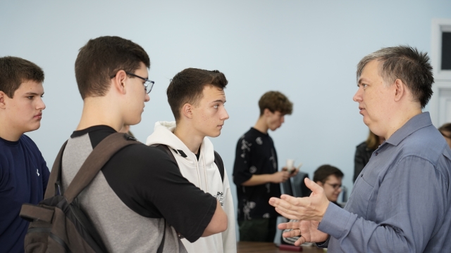 Викладачі завзято розкривали цікавинки професій, які майбутні студенти можуть опанувати під час відвідування їх дисциплін. Доцент кафедри Борис Гусєв - представив лабораторію "Проектування цифрових пристроїв" та розповів, що вивчають студенти на заняттях з комп'ютерної електроніки, логіки і схемотехніки. Показав роботу лабораторних стендів "Trigger" і "Logic".