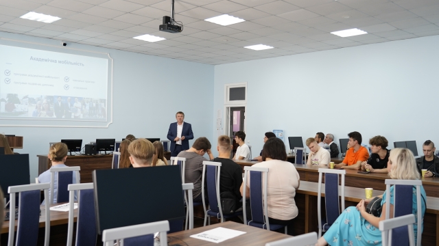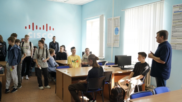 Старший викладач кафедри Володимир Матієвський представив особливості комп'ютерної лабораторії "Мережева Академія CISCO" та відповів на запитання зацікавлених гостей - а саме, які сертифікати можна отримати під час вивчення дисциплін "Комп'ютерні мережі" та "Адміністрування комп'ютерних мереж" і як ці сертифікати ефективно допоможуть у працевлаштуванні за фахом.