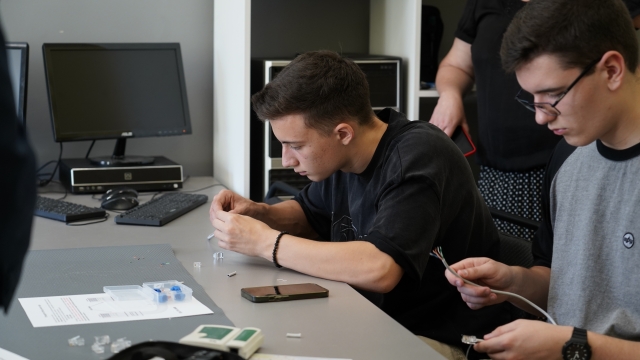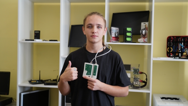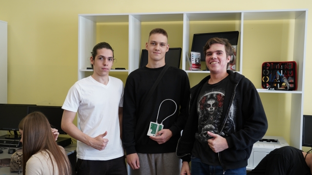 На завершення екскурсії на кафедрі відбувся конкурс з цінними призами на знання і вміння створення комп'ютерного мережевого кабелю - "пачкорду". Конкурс виявив неабиякий інтерес у гостей факультету. Допомогали учасникам конкурсу студенти спеціальності 123 "Комп'ютерна інженерія" - Олександр Колесніков (магістр 1 року), Анатолій Касаткін (магістр 1 року), Богдан Міхеєв (бакалавр 4 курсу).