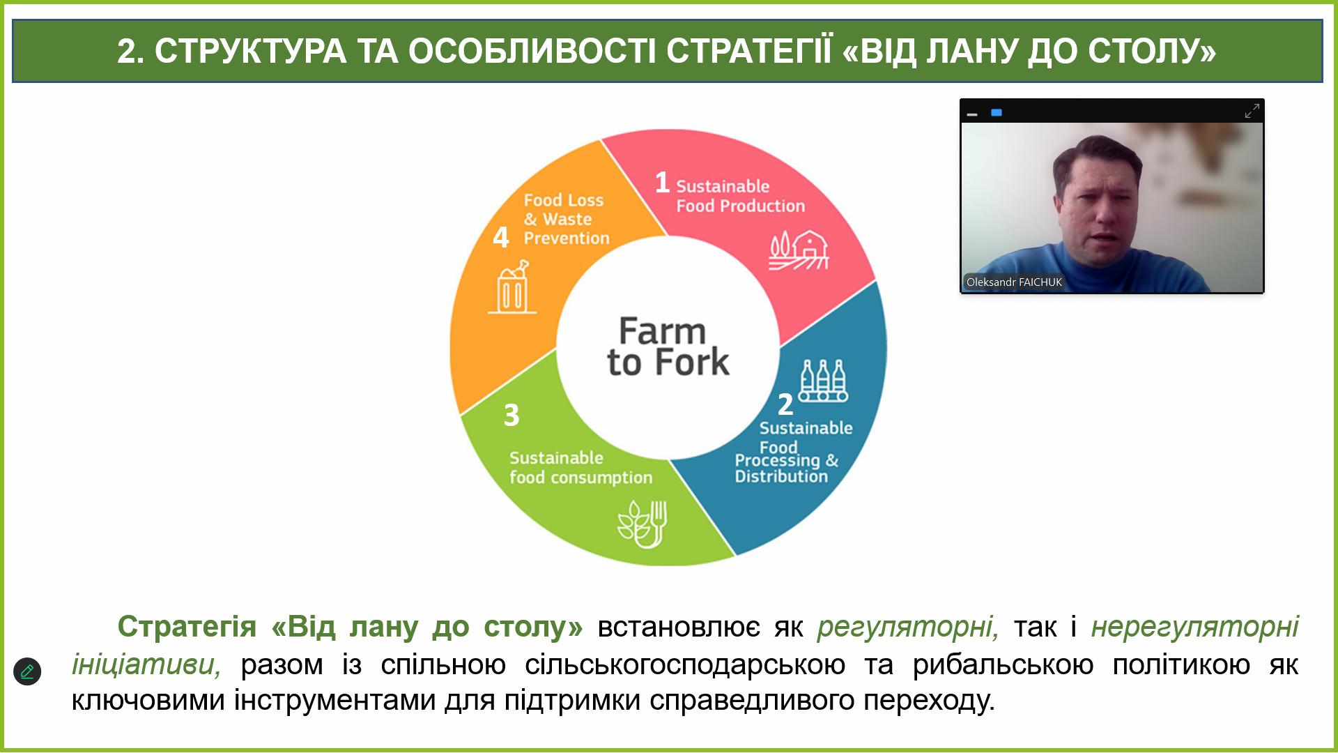 За перший місяць навчання слухачі мали змогу прослухати від доцента кафедри адміністративного менеджменту та ЗЕД Олександра ФАЙЧУКА лекції присвячені розкриттю сутності та особливостей Європейської зеленої угоди та її ролі у сучасній трансформації сільського господарства. Також не менш цікавими виявились й практичні заняття. Тут студенти, крім поглиблення розуміння напрямів Зеленої угоди ЄС, також вчились оцінювати прогрес різних країн-членів ЄС та України, як країни-кандидата на вступ до ЄС, у досягненні цілей стратегії «Від ферми до виделки» до 2030 р. через аналіз цільових індикаторів (використання пестицидів, втрати поживних речовин, використання мінеральних добрив, продажу антибіотиків для застосування у тваринництві, розширення площ під органічне землеробство). З метою кращого засвоєння навчального матеріалу викладачем було застосовано сучасні аудіо-візуальні методи.