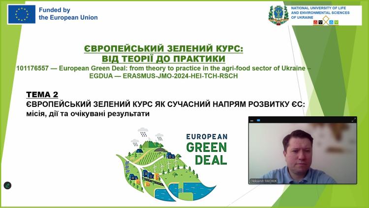 У рамках реалізації проєкту Еразмус+ «Модуль Жан Моне» «European Green Deal: from theory to practice in the agri-food sector of Ukraine» - 101176557 – EGDUA – ERASMUS-JMO-2024-HEI-TCH-RSCH протягом лютого 2026 р. відбулись лекційні і практичні заняття в дистанційному форматі із дисципліни «Європейський зелений курс» для студентів ОС «Магістр» різних спеціальностей НУБіП України. У цьому семестрі курс обрали 83 студенти з наступних факультетів: аграрного менеджменту, економічного, агробіологічного, факультету захисту рослин і гуманітарно-педагогічного.
