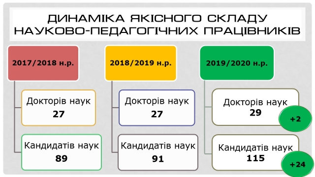 Порівняно з минулим роком кількість докторів наук збільшилася на 2 особи і становить 29 осіб. Кількість кандидатів наук у поточному році становить 115 осіб, що на 24 особи більше порівняно з минулим навчальним роком.