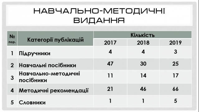Підготовлено і видано у звітному році 3 підручники, 25 навчальних посібників, 17 навчально-методичних посібників, 66 методичних рекомендацій, 5 словників, 3 довідники.