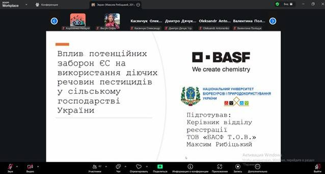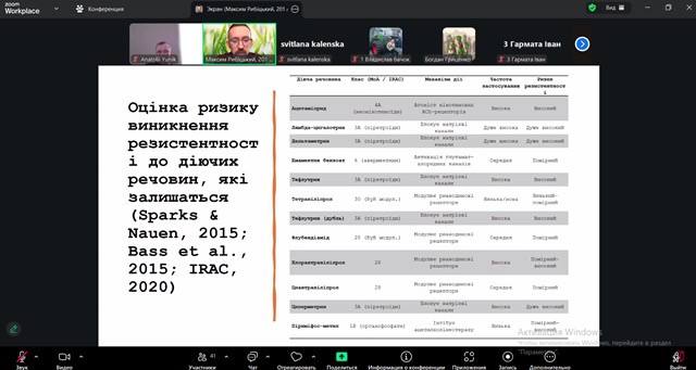 Після вступного слова завідувача кафедри д. с.-г. наук, професора, академіка НААН України Світлани КАЛЕНСЬКОЇ Максим РИБІЦЬКИЙ надав інформацію щодо сучасних тенденцій обмеження та заборони окремих діючих речовин у країнах ЄС та їх можливі наслідки для українського аграрного виробництва.
