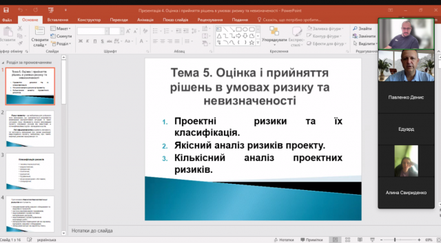 Під час лекції Іван СІЧКАР приділив особливу увагу аналізу таких фінансових показників, як чиста теперішня вартість (NPV), внутрішня норма дохідності (IRR), період окупності, а також розглянув неформальні критерії, такі як вплив соціальних та екологічних факторів на прийняття рішень у сфері проектного аналізу. Студенти активно обговорювали питання вибору критеріїв для оцінки ефективності проектів в умовах нестабільності та ризиків, що є особливо актуальним для українського бізнесу в нинішніх умовах.