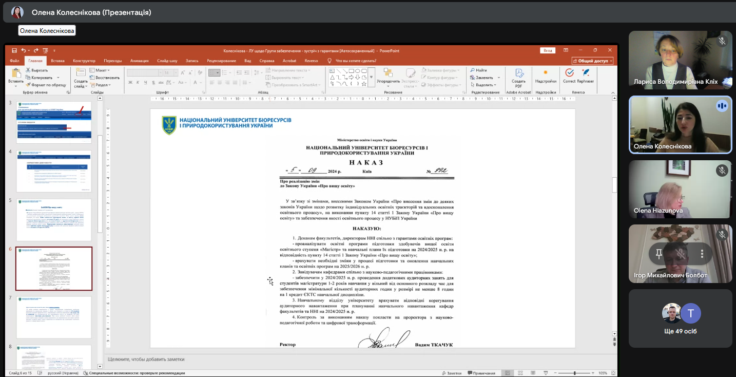 Для забезпечення якісної підтримки гарантів у проведенні самооцінювання, вона представила низку документів, які структурують організацію та проведення цієї процедури. Увага присутніх акцентувалась на «Роз’ясненнях щодо застосування критерії оцінювання якості освітньої програми», підготовлених Національним агентством із забезпечення якості вищої освіти, а також семирічному досвіді проходження акредитацій, накопиченому в нашому університеті.