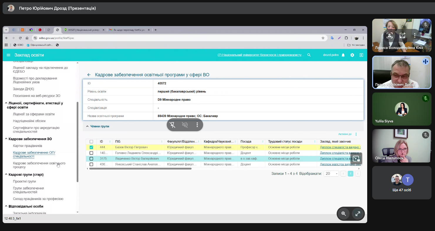 Заступник начальника навчального відділу Олена КОЛЕСНІКОВА акцентувала увагу присутніх на кадровому потенціалі групи забезпечення освітніх програм. Особливу увагу приділено виконанню ліцензійних умов науково-педагогічними працівниками, які забезпечують викладання обов’язкових освітніх компонентів. Перевірка їх професійних досягнень — публікацій, стажування, підручників та навчальних посібників є критичною точкою такої підготовки.
