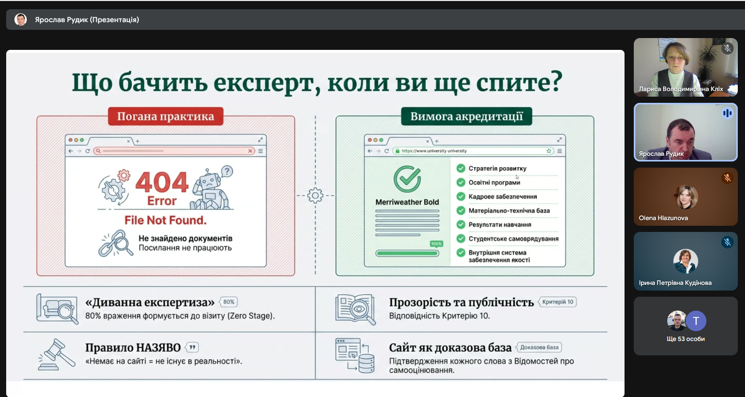 Цифрова прозорість та робота з сайтом університету стала основою доповіді керівника центру забезпечення якості освіти Ярослава РУДИКА. Сайт університету — це «обличчя» програми для експертів та абітурієнтів. Гаранти отримали рекомендації щодо актуалізації сторінок випускових кафедр — від публікації актуальних робочих програм до оприлюднення результатів опитувань.