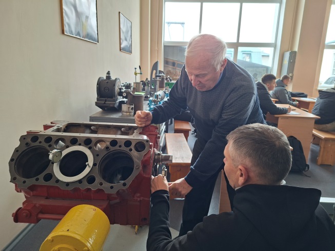 Завідувач лабораторіями Юрій Лисіков разом з майстром виробничого навчання Серафимом Лопатьком оцінюють технічний стан деталей та встановлюють можливість їх відновлення. |