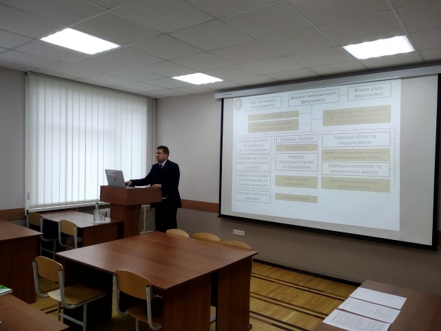 У своїй доповіді він зазначив, що на сьогодні до складу економічного факультету входять 8 кафедр, які забезпечують підготовку фахівців ОС «Бакалавр» та ОС «Магістр» за 4 спеціальностями.