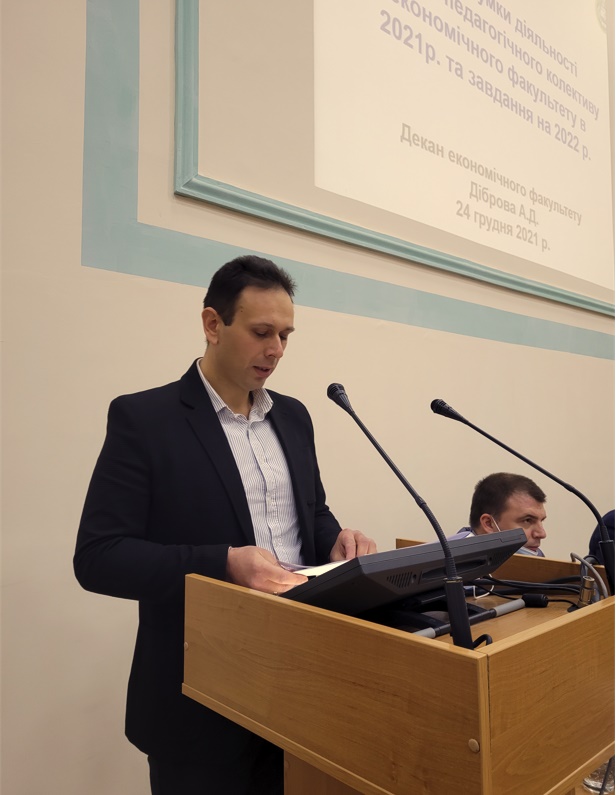 24 грудня відбулися збори трудового колективу економічного факультету в очному режимі, на яких декан економічного факультету Анатолій Діброва прозвітував «Про підсумки діяльності науково-педагогічногоколективу економічного факультету в 2021 році та завдання на 2022 рік».