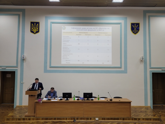 У своїй доповіді Анатолій Діброва відзначив, щона сьогодні до складу економічного факультету входять 7 кафедр, які забезпечують підготовку фахівців ОС «Бакалавр» та ОС «Магістр» за 4 спеціальностями.