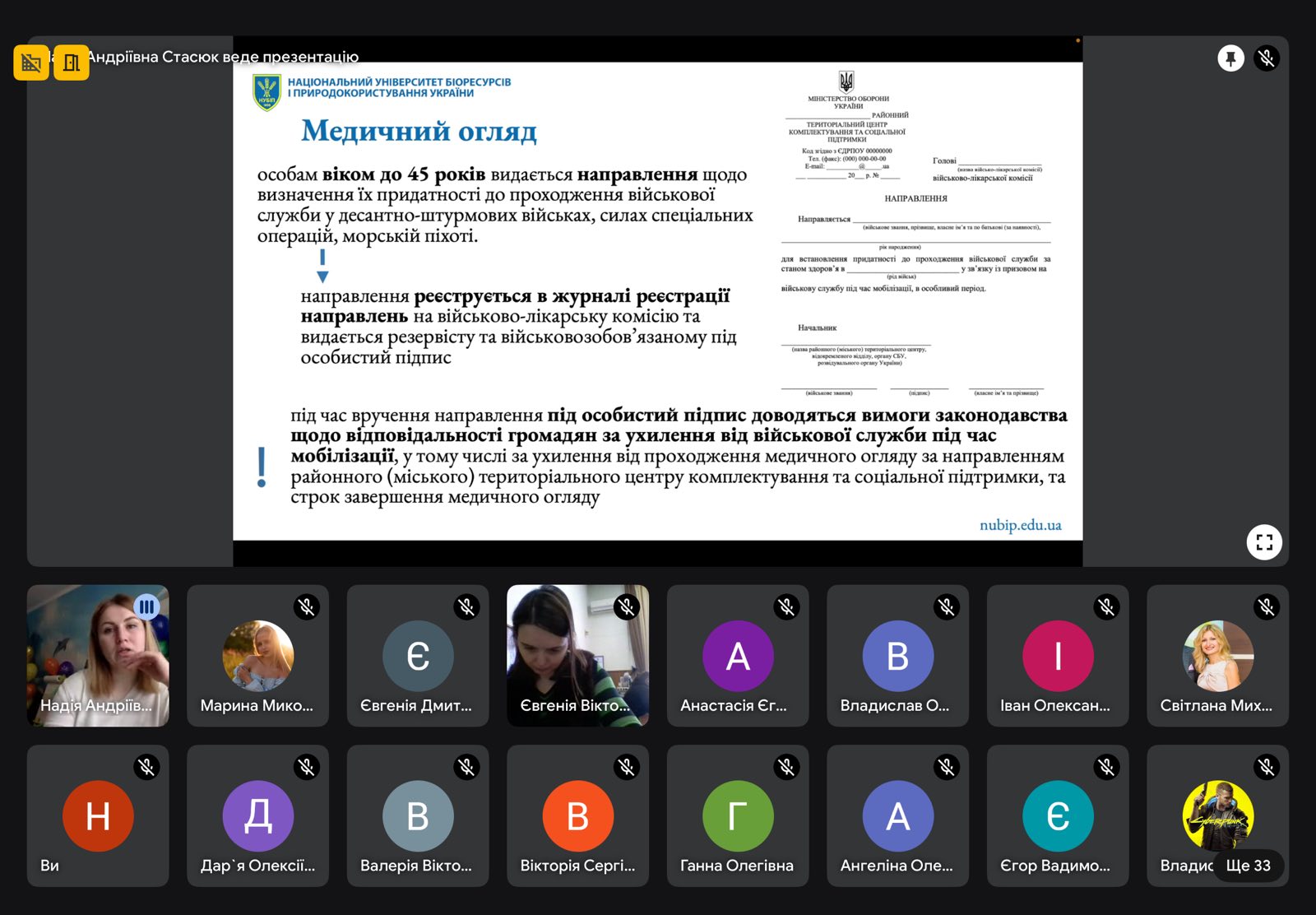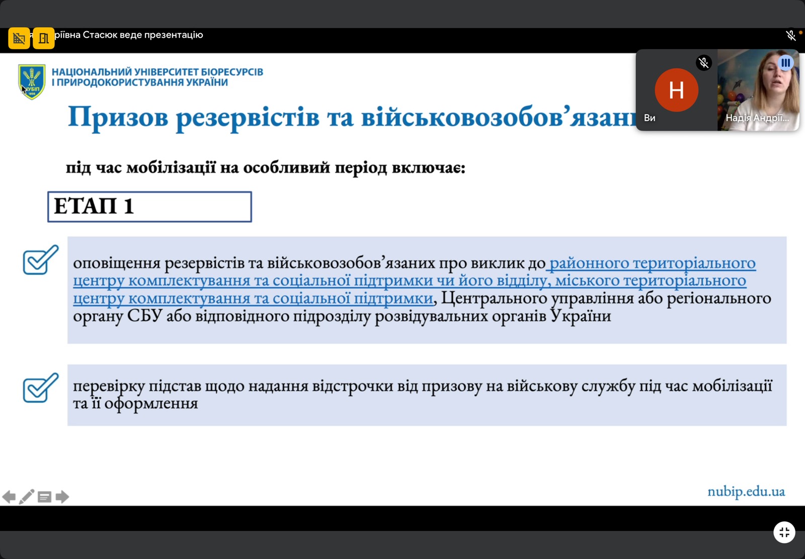 Окремим блоком лекції стали питання правового статусу громадян під час мобілізації. Було роз’яснено обов’язки військовозобов’язаних та резервістів щодо явки до територіальних центрів комплектування та соціальної підтримки, проходження військово-лікарської комісії, уточнення військово-облікових даних, а також порядок вручення повісток і дії громадян у разі неможливості своєчасного прибуття за викликом. Акцент зроблено на необхідності дотримання встановлених законодавством строків і процедур.