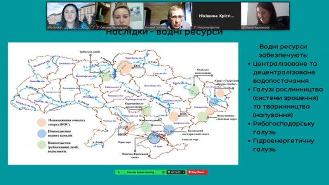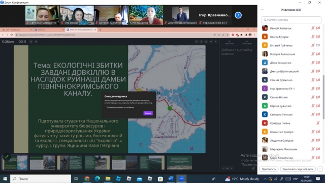 Студентка 4 курсу Юлія Яцишина представила свою доповідь на тему «Екологічні збитки завдані довкіллю в наслідок руйнації дамби Північнокримського каналу». Підводячи підсумок своєї доповіді, студентка зауважила, що підрив частини каналу на Херсонщині призвів до екологічної загрози не лише на території півострова. Підрив унеможливив зрощування сільськогосподарських земель на території Скадовського та Каховського районів Херсонської області.