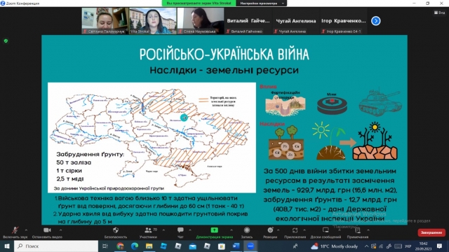 З досить актуальною темою доповіді «Російсько-українська війна: виклики для водної та продовольчої безпеки» виступила доцент кафедри екології агросфери та екологічного контролю Віта Строкаль. Вона зосередила увагу учасників конференції на основних ризиках, які виникли для водних та земельних ресурсів в результаті військових дій. Зокрема обґрунтувала вплив таких дій як будівництво фортифікаційних споруд, мінування територій, вибухи та просування важкої техніки, які спричинили руйнування агроландшафтів, ущільнення ґрунтового покриву та забруднення його важкими металами й різними хімічними речовинами. Зосередила увагу учасників на проблемах водозабезпечення для галузей сільського господарства, які виникли через пошкодження водної інфраструктури (дамби, греблі, очисні станції тощо) та систем зрошення. Віта Петрівна також навела кілька прикладів – наслідків від руйнування Каховської дамби.