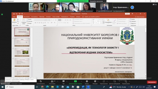Доповідь Ігора Кравченка студента 4 курсу спеціальності 101 Екологія була зосереджена на актуальній проблематиці захист та відтворення водних екосистем. Через значне забруднення води, і потрапляння туди різних біогенних та хімічних речовин, призвело до значного погіршення якості води. Не контрольовані скиди та засмічення вод, змусили шукати шляхи зменшення негативних наслідків антропогенної діяльності. Доповідач наголосив, що основними функціями екоремедіації є висока продуктивність, здатність до самоочищення, збільшення біотичного різноманіття та утримання води. Використовуючи екоремедіації (фіторемедіації, зони фугу та побудовані водно-болотні угіддя), ми можемо відновити деградовані території (кам’яні ями, узбіччя доріг), усунути надмірний вміст поживних речовин та очистити стічні води.