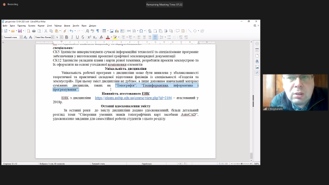 Ведучі викладачі доповіли про зміст Робочих програм дисциплін, їх місце в освітній програмі, вміння, знання, компетенції, які отримує здобувач вищої освіти при їх вивченні, унікальність чи особливості РП дисциплін відносно таких дисциплін в інших університетах України і зарубіжжя, наявність атестованих ЕНК, останні вдосконалення змісту робочих програм цих дисциплін. Зокрема, канд. с.-г. наук, доцент Богданець В’ячеслав Анатолійович доповів стосовно робочих програм дисциплін «Топографічне креслення та інженерна графіка», «Тематичне картографування земель», д-р екон. наук, професор Євсюков Тарас Олексійович – «Топографія», канд. екон. наук., доцент Жук Олексій Павлович – «Геодезія», «Електронні геодезичні прилади», старший викладач Ковальов Микола В’ячеславович – «Вища геодезія», «Супутникова геодезія», д-р геогр. наук, професор Ковальчук Іван Платонович – «Картографія», «Регіональний геоекологічний моніторинг», канд. екон. наук., доцент Кривов’яз Євгенія Вікторівна – «Математична обробка геодезичних вимірів», канд. екон. наук., ст. викладач Малашевська Олена Анатоліївна – «Основи інженерної геодезії», канд. екон. наук, доцент Опенько Іван Анатолійович - «GNSS спостереження в прикладних задачах геодезії», канд. екон. наук., доцент Шевченко Олександр Вікторович – «Топографо-геодезичне забезпечення земельно-кадастрових робіт».