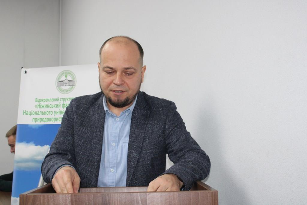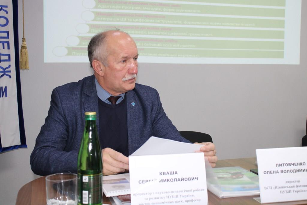 Проректор з науково-педагогічної роботи та розвитку НУБіП України Сергій КВАША передав вітання та висловив підтримку колективу коледжу від ректорату університету. Подякував за плідну роботу та громадянську позицію, наголосивши, що на сьогоднішній день одна з наших основних місій — всіляка допомога й підтримка ЗСУ, а також мобілізація спільних зусиль на освітянській ниві. Відзначив професійний підхід керівництва коледжу до вирішення важливих питань діяльності закладу освіти, високий фаховий рівень педагогічного колективу та наголосив, що університет пишається здобутками своїх відокремлених структурних підрозділів, серед яких достойне місце посідає Ніжинський фаховий коледж НУБіП України. Сергій Миколайович звернув увагу присутніх на те, що якість навчання й кадрове забезпечення, особливо технічних спеціальностей, має постійно залишатися в пріоритеті адміністрації та всього колективу. Зробив акцент на важливості виховної роботи й національно-патріотичного виховання студентської молоді, адже всі мають знати, пам’ятати та поважати історію й традиції свого народу. Зупинився на питаннях щодо пошуку нових форм профорієнтаційної роботи та необхідності постійного вдосконалення методик викладання з урахуванням щоденних викликів. Подякував колективу коледжу за безперервну допомогу ЗСУ, патріотизм і відданість своїй справі задля розвитку закладу освіти, університету й нашої держави та побажав усім міцного здоров’я, успіхів, неодмінної перемоги та добробуту в кожній родині.