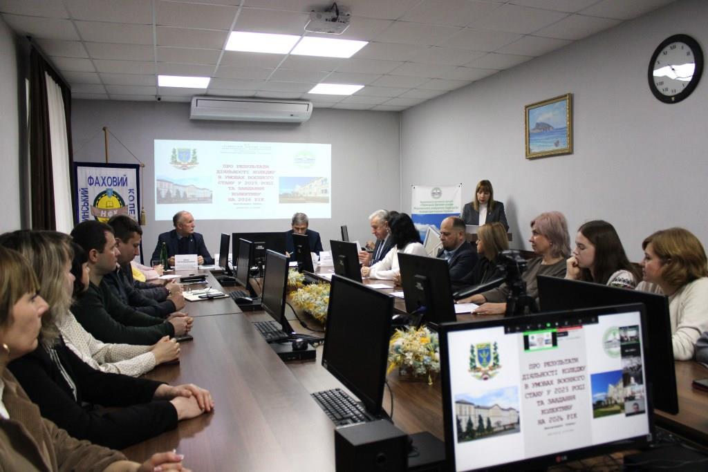 Під час виступу керівником було узагальнено результати діяльності коледжу за 2025 рік, який проходив у складних умовах воєнного стану. Проаналізовано роботу структурних підрозділів, окреслено досягнення та проблемні питання. Попри складні умови воєнного часу, колектив коледжу продемонстрував високий рівень організованості, професійності та стійкості, забезпечивши стабільність освітнього процесу й належний рівень безпеки всіх учасників освітнього середовища.