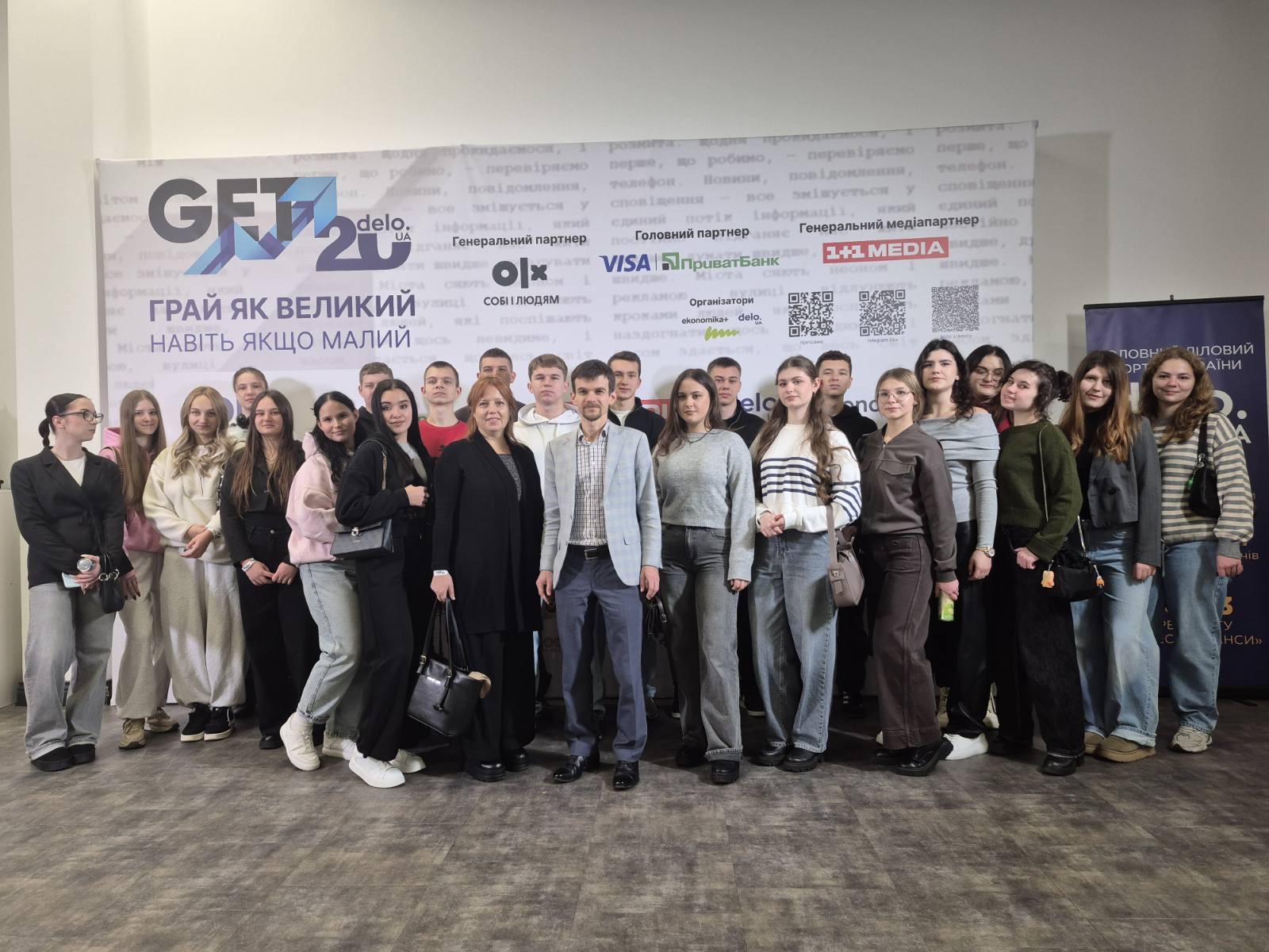 18 листопада 2025 року здобувачі 1-го курсу ОП «Облік і аудит» спеціальності «Облік і оподаткування» (серед яких – учасники наукового гуртка «Студія професійного бухгалтера») разом зкуратором Катериною Шевчук взяли участь щорічному фестивалі для малого та середнього бізнесу під егідою Delo.ua «GET Business festival 2025».