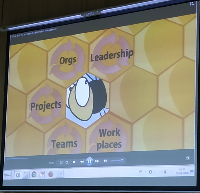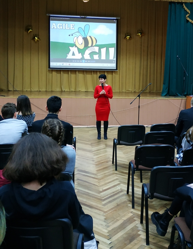 Катерина Алексеєва розповіла майбутнім абітурієнтам про проектний менеджмент, різницю між водопадними проектами та agile-проектами, які можна використати для реалізації своїх ідей. Наприкінці своєї частини тренінгу Катерина Алексеєва запропонувала учням подивитися коротке навчальне відео англійською мовою про проекти.