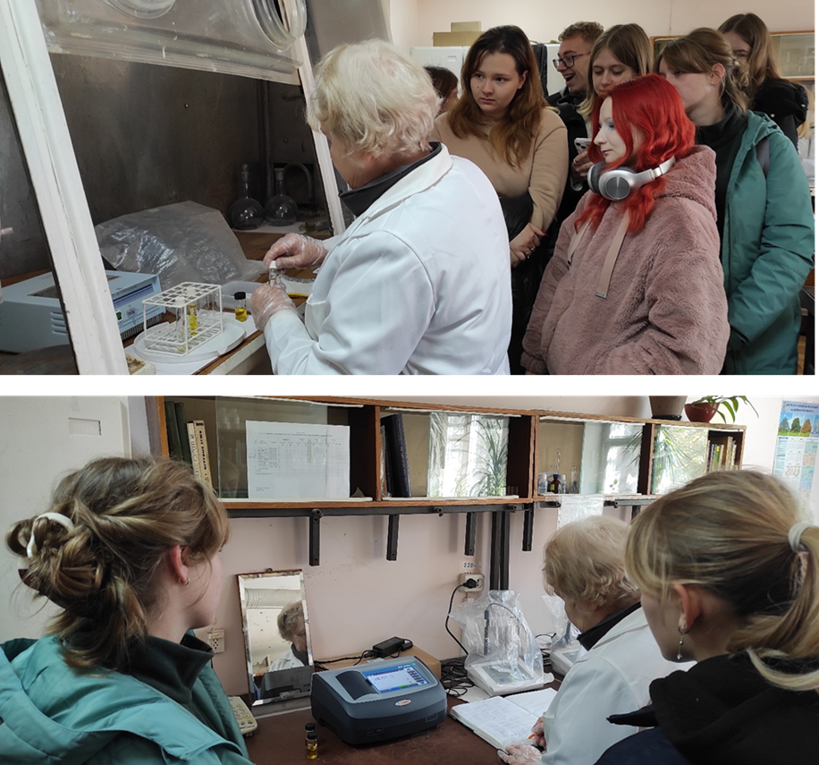 У Лабораторії гідробіології здобувачі отримали можливість ознайомитися із сучасними європейськими підходами, що базуються на затверджених показниках відповідно до прийнятої Європейської Рамкової водної Директиви. Власне акцент було зроблено на біологічному моніторингу поверхневих вод. Начальник лабораторії Тетяна Олександрівна КУЗНЄЦОВА розповіла про специфіку гідробіологічних польових досліджень, періодичність їх проведення та подальшу ідентифікацію за видовим складом фітопланктону, зоопланктону, фіто- та зообентосу в лабораторних умовах. Студенти-екологи ознайомилися із біологічними зразками одноденок, водяних клопів, волохокрильців, хірономід, олігохет, які є біологічними індикаторами стану водойм.