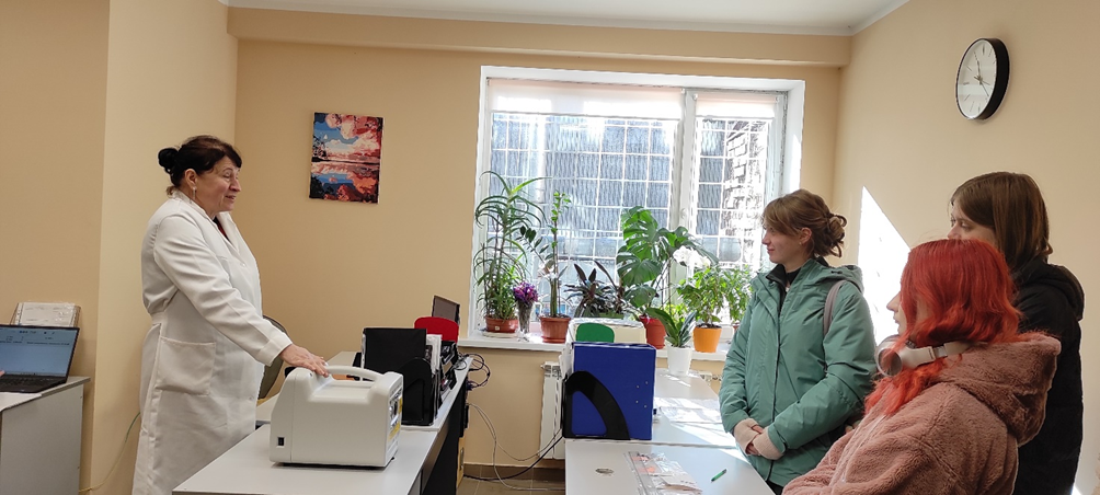 В Лабораторії спостережень за забрудненням атмосферного повітря знайомство із діяльністю структурного підрозділу проводила начальник лабораторії Ніна Петрівна РОТАЧ. Вона розповіла молодим людям про діяльність стаціонарних спостережних постів за моніторингом якості повітря у різних районах міста Києва, Чернігова і Житомира, про особливості відбору проб повітря, їх періодичність та про перелік показників, які аналізуються. Крім того, вона зупинилася на тому, яким чином надсилають інформацію до ЦГО із пунктів спостережень, як здійснюється їх подальший аналіз, систематизація і архівація. Також студенти мали змогу ознайомитися із приладами, які використовуються для відбору проб повітря для подальшого аналізу полютантів. Ніна Петрівна продемонструвала електроаспіратор ASA-4S (220B), призначений для відбору проб атмосферного повітря на стаціонарних постах. Його використовують в подвійному режимі: як за участі оператора так і без в автоматизованому режимі за заданою добовою програмою.