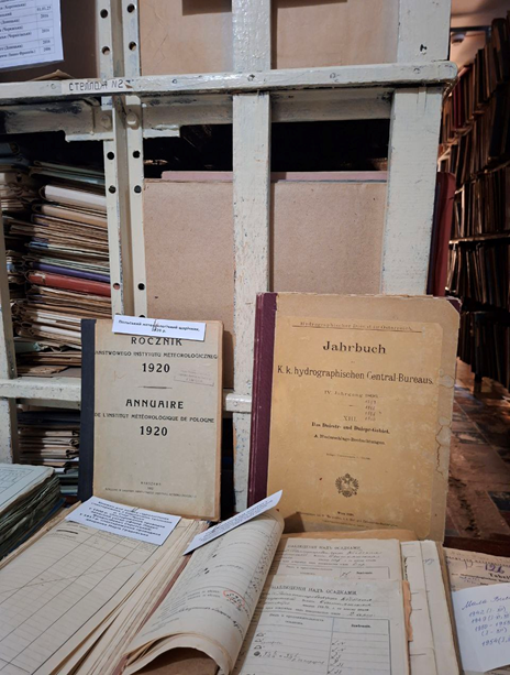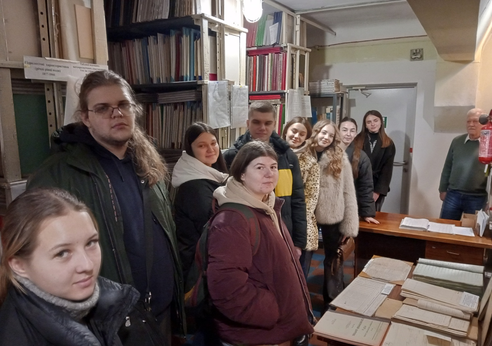 Далі із з наявною в архіві інформацією знайомила нас співробітниця архіву Ольга Віталіївна ГУК, яка показала нам раритетні архівні матеріали середини IX століття щодо представлення метеопоказників, зокрема температури і вологості повітря. Студенти ознайомилися із записами у щорічниках, де відмічені добові, місячні і річні дані з фіксації метеорологічних показників по різних населених пунктах України. Окрім збереження важливої інформації на паперових носіях, частина даних паралельно зберігається і на технічних (електронних) носіях. Позитивним є той факт, що в процесі підготовки магістерської чи бакалаврської кваліфікаційної робіт студенти спеціальності Е2 «Екологія», за бажанням, можуть сміливо користуватися статистичними матеріалами із різних фондів архіву, а це агрометеорологічні, аерологічні, гідрологічні, метеорологічні, синоптичними показниками, даними спостережень за станом забруднення природного середовища, інформаційно-довідковою та нормативною літературою. Єдиною юридичною вимогою для цього є створення відповідного листа-запиту (дозволу) від університету для отримання необхідних даних.