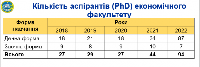 В 2022 році на факультеті навчається 94 аспіранти: на спеціальності 051 Економіка – 51, 071 Облік і оподаткування – 12, 072 Фінанси банківська справа та страхування – 24, 076 Підприємницвто торгівля та біржова діяльність – 7.