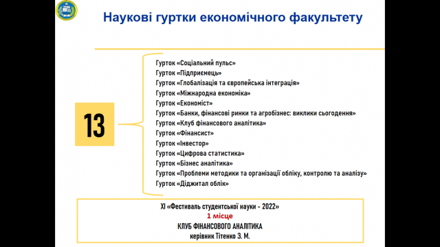 На факультеті функціонує 13 наукових студентських гуртків. Цього року на ХІ «Фестиваль студентської науки – 2022» 1 місце виборов гурток «КЛУБ ФІНАНСОВОГО АНАЛІТИКА» – керівник Тітенко З. М.