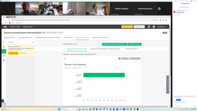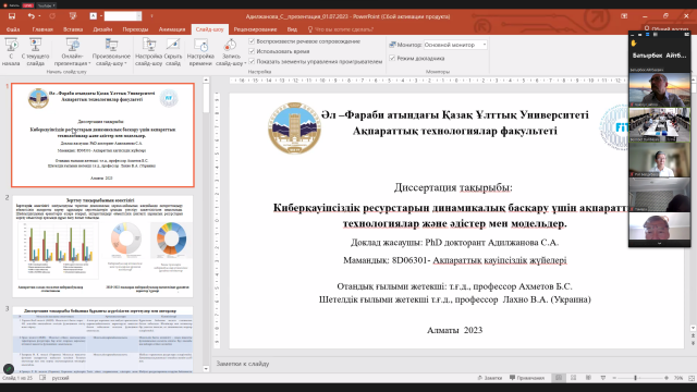 04.07.2023 відбувся успішний захист дисертаційної роботи докторанта спеціальності «8D06301–«Системи інформаційної безпеки» Аділжанової Салтанат Альмуханбетівни (Республіка Казахстан) на тему: «Методи, моделі та інформаційні технології для динаміки». Науковий консультант: д.т.н., професор, Ахметов Б.С.