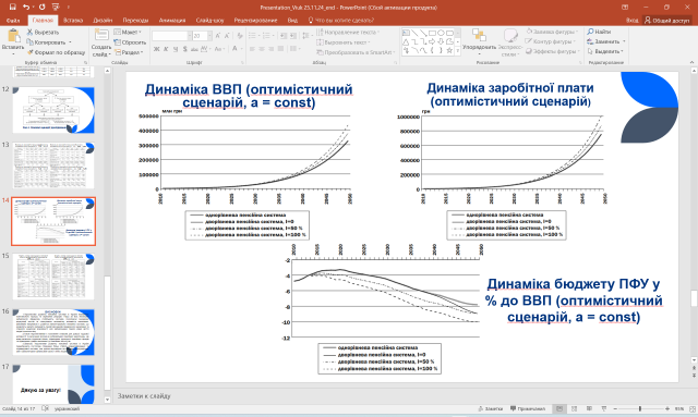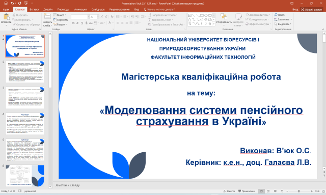 На факультеті інформаційних технологій 26 листопада 2024 року відбувся попередній захист магістерських кваліфікаційних робіт студентів спеціальності 051 «Економіка» за освітньо-професійною програмою «Економічна кібернетика». Цей захід став кульмінацією півтора року наполегливої праці магістрів, досліджень та інноваційного підходу до вирішення актуальних економічних проблем спираючись на інструментарій економіко-математичного моделювання. Зі вступним словом звернувся до присутніх завідувач кафедри, к.е.н., доцент Харченко Володимир Віталійович, який наголосив на важливості обґрунтування та прийняття управлінських рішень в економіці, спираючись на економіко-математичне моделювання економічних процесів та побажав всім успіхів! Різнопланові, актуальні та цікаві теми були представлені на попередньому захисті! Першим виступив Олексій В'юк, який досліджував проблеми моделювання системи пенсійного страхування в Україні (науковий керівник – к.е.н., доцент Галаєва Л.В.). Його робота охоплює аналіз поточного стану пенсійної системи, виявлення основних проблем та пропозиції щодо їх вирішення через математичне моделювання сценаріїв її розвитку.