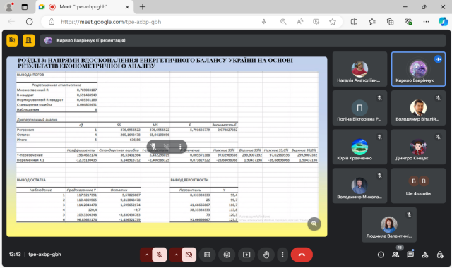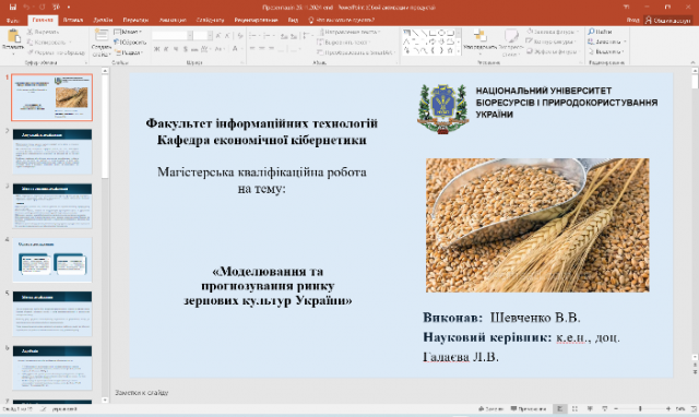 Доповідь Ваврінчука Кирила («Економічний аналіз енергетичного балансу України», науковий керівник – д.е.н., доцент Кравченко В.М.) стосувалася надзвичайно актуальної теми сьогодення й цікавим було почути пропозиції студента щодо напрямів вдосконалення галузі. Владислав Шевченко презентував роботу, присвячену моделюванню та прогнозуванню ринку зернових культур України (науковий керівник: к.е.н., доцент Галаєва Л.В.). Його дослідження допомагає зрозуміти тенденції розвитку ринку та пропонує ефективні моделі для прогнозування обсягів виробництва та цін на зернові.